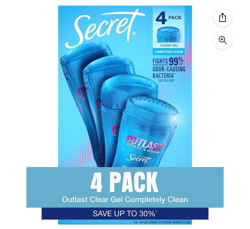 - Secret Outlast Clear Gel Deodorant, Completely Clean, 2.6 oz., 4 pk.